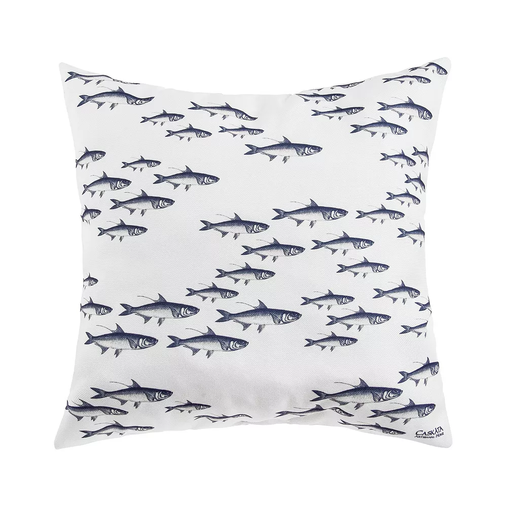- This blue throw pillow with a school of fish is the perfect accessory to complete your cabin, beach, or coastal decor.