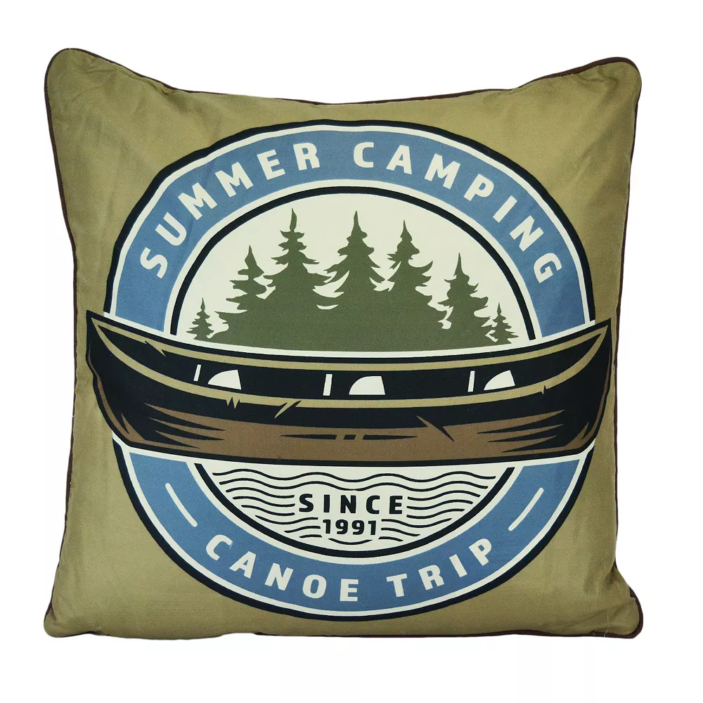 - The Mountain Stream Camping Decorative Pillow features a canoe with the script “Summer Camping Canoe Trip” in a circular emblem adorned on a sage green background. The reverse side is also the same as the front