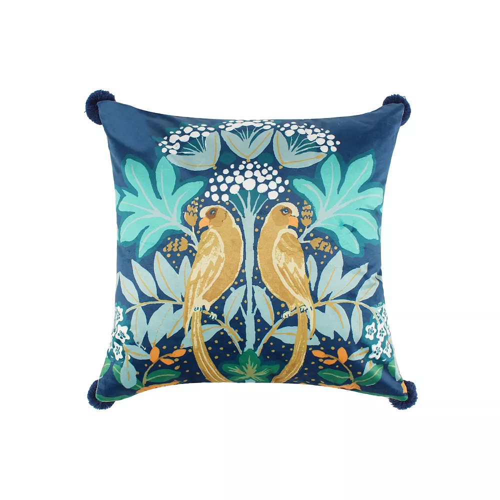 - Features two detailed birds perched on a flower stem with various multicolor leaves and flowers behind with corner puff pom poms.