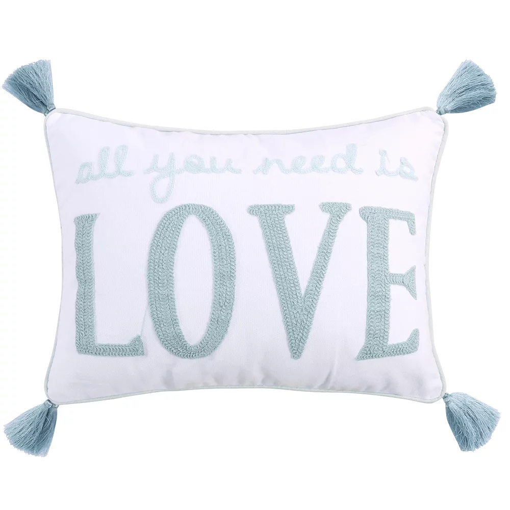 - The words “ALL YOU NEED IS LOVE” beautifully stitched in aqua and gray on a white canvas.