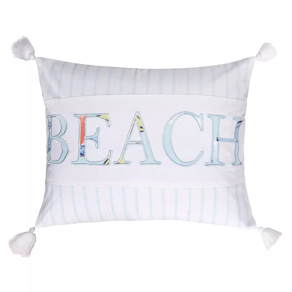 - The word “beach” appliqued in the Sancti Petri fabric against a ticking stripe background.
