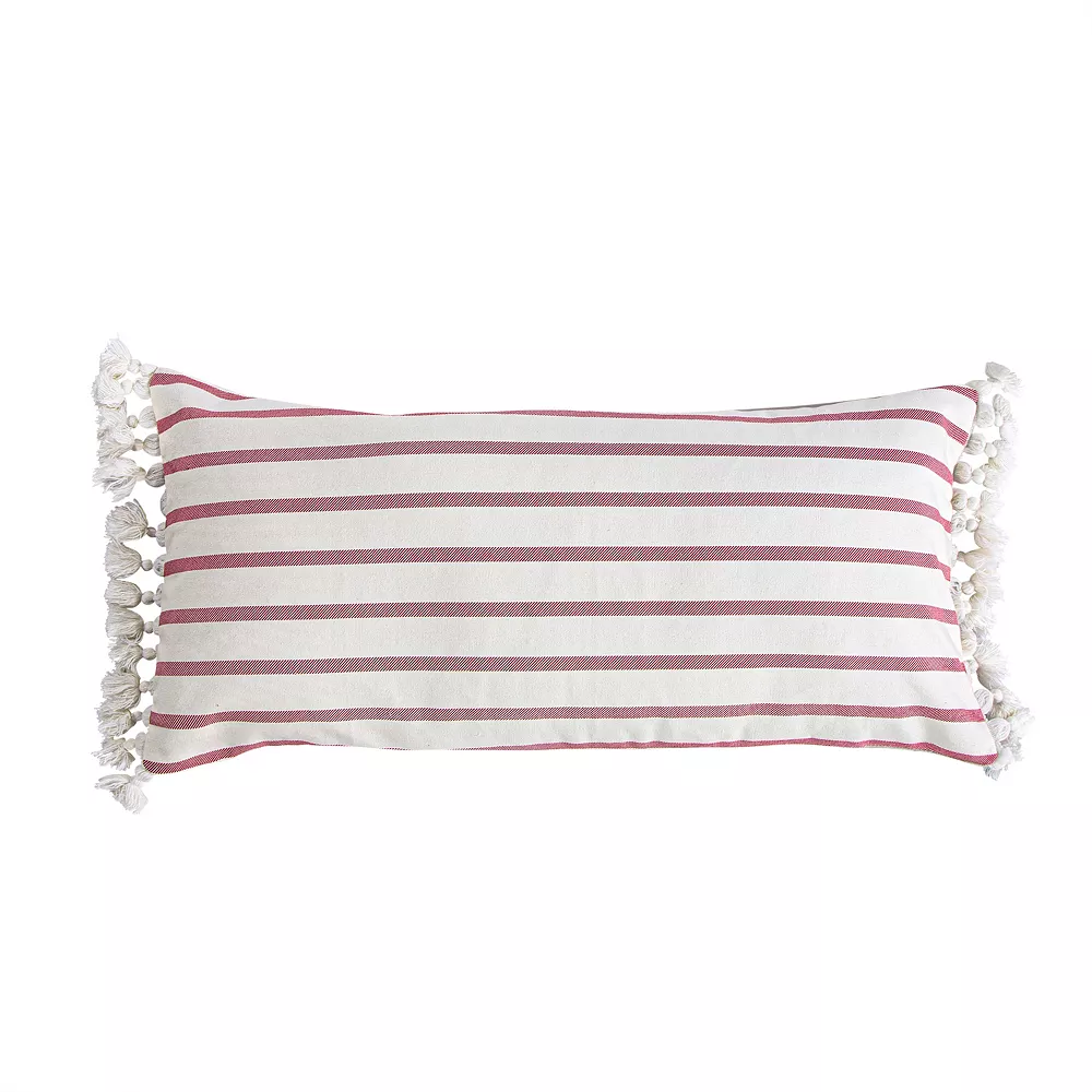 - Features a gorgeous oversized pillow in red ticking stripe finished with white pom poms in each corner.