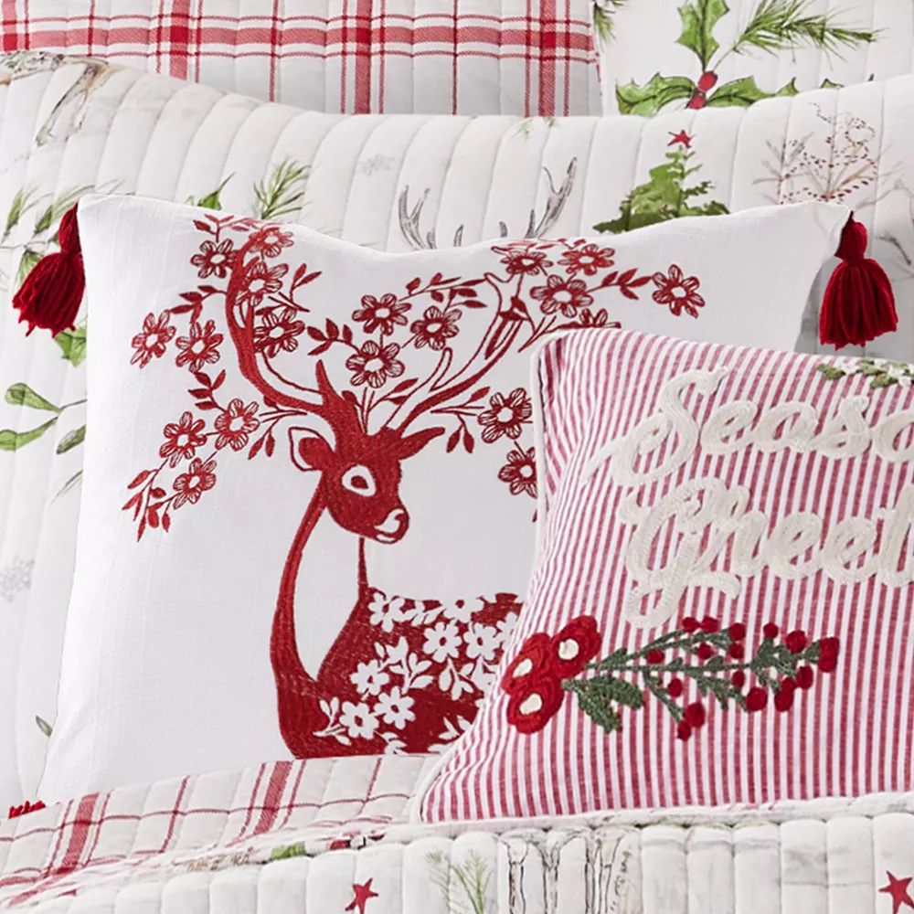 - Features a fanciful deer screenprinted on a faux linen ground, finished with red pom poms in each corner.