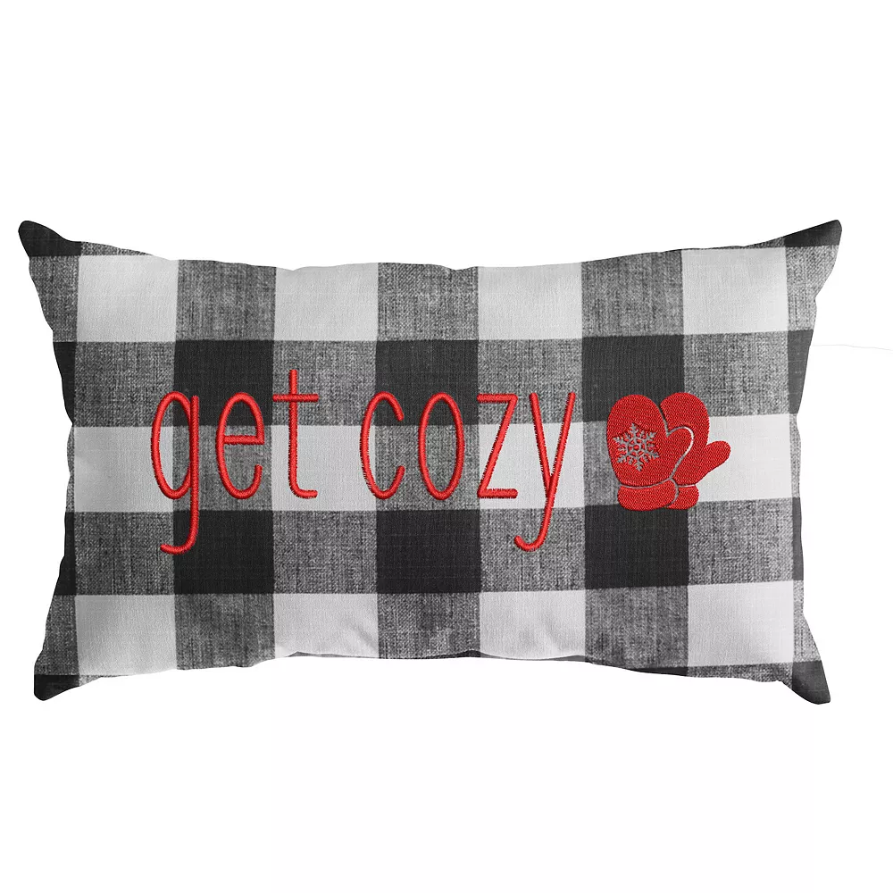 - Rectangular soft and cuddly pillow with “get cozy” inscription