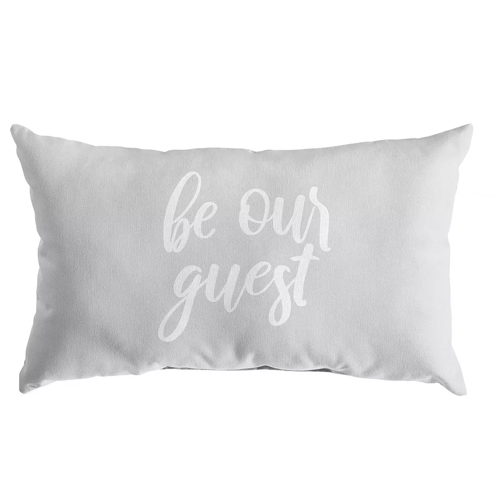 - Rectangular decorative lumbar pillow with “be our guest” inscription