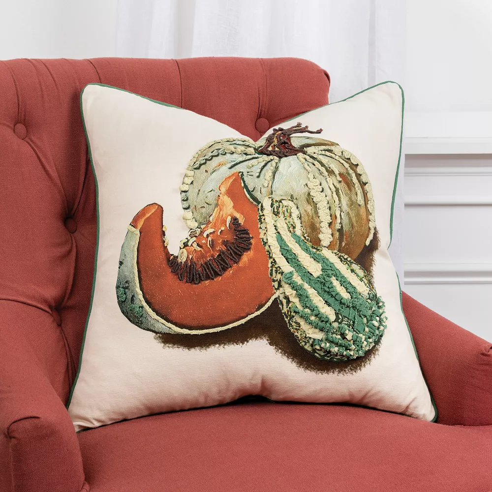 This Rizzy Home Gourds Throw Pillow is a sure sign of fall harvest. The Heavily textural embroidered accents bring a cozy and luxurious look to any room.