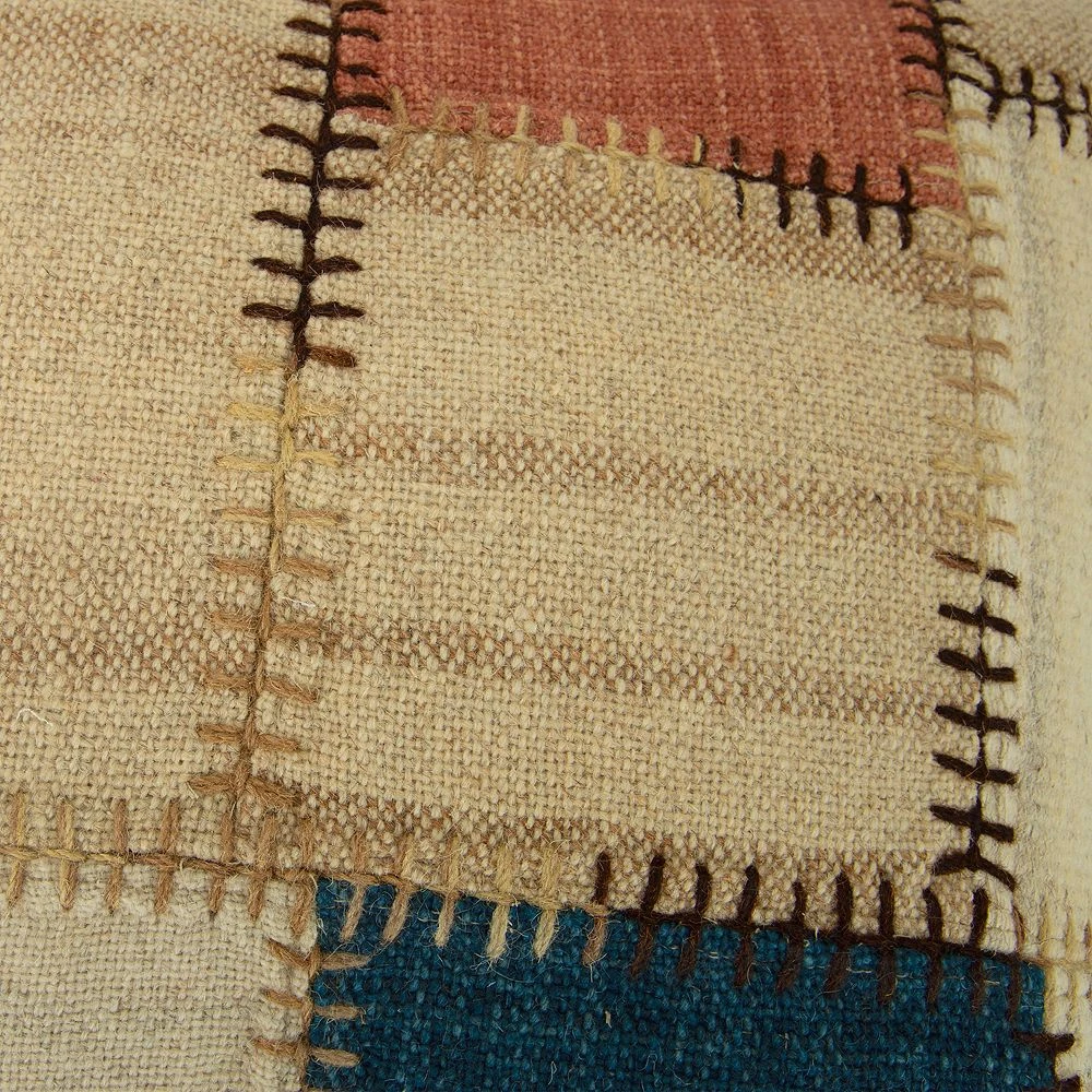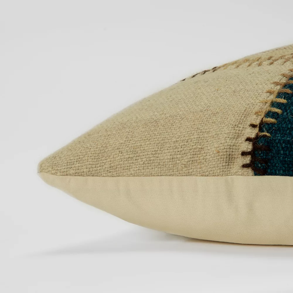 This pillow features an arts and crafts rugged color block presentation. Exaggerated button hole stitches appear to hold the pattern blocks together and offer an artisinal handcrafted patterning.