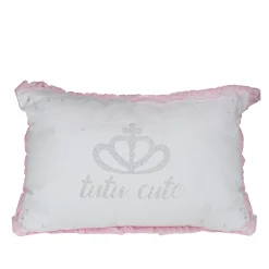 Celebrate the aspiring prima ballerinas in your life with this adorable throw pillow. Glittered lettering paired with ruffled trim make this pillow the perfect to your little ballerina’s decor. Perfect for birthdays. Features: White ballerina pillow. Glittered letters read “Tutu Cute. Pink ruffled trim. Glittered star accent and crown. For indoor use only. Dimensions: 12.5H x 17.5W x 5.5D. Material(s): cotton
