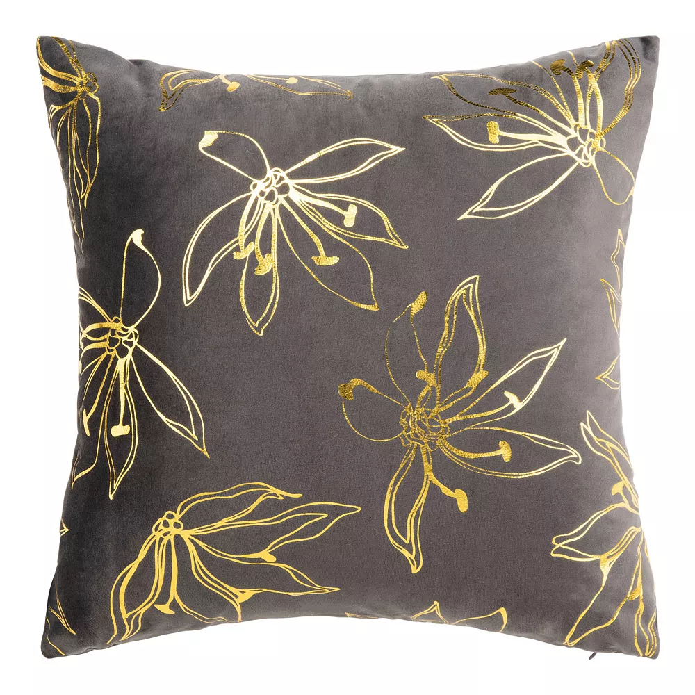 Shimmering gold-toned clematis blossoms are beautifully sketched across this organically glam Safavieh Yari throw pillow.