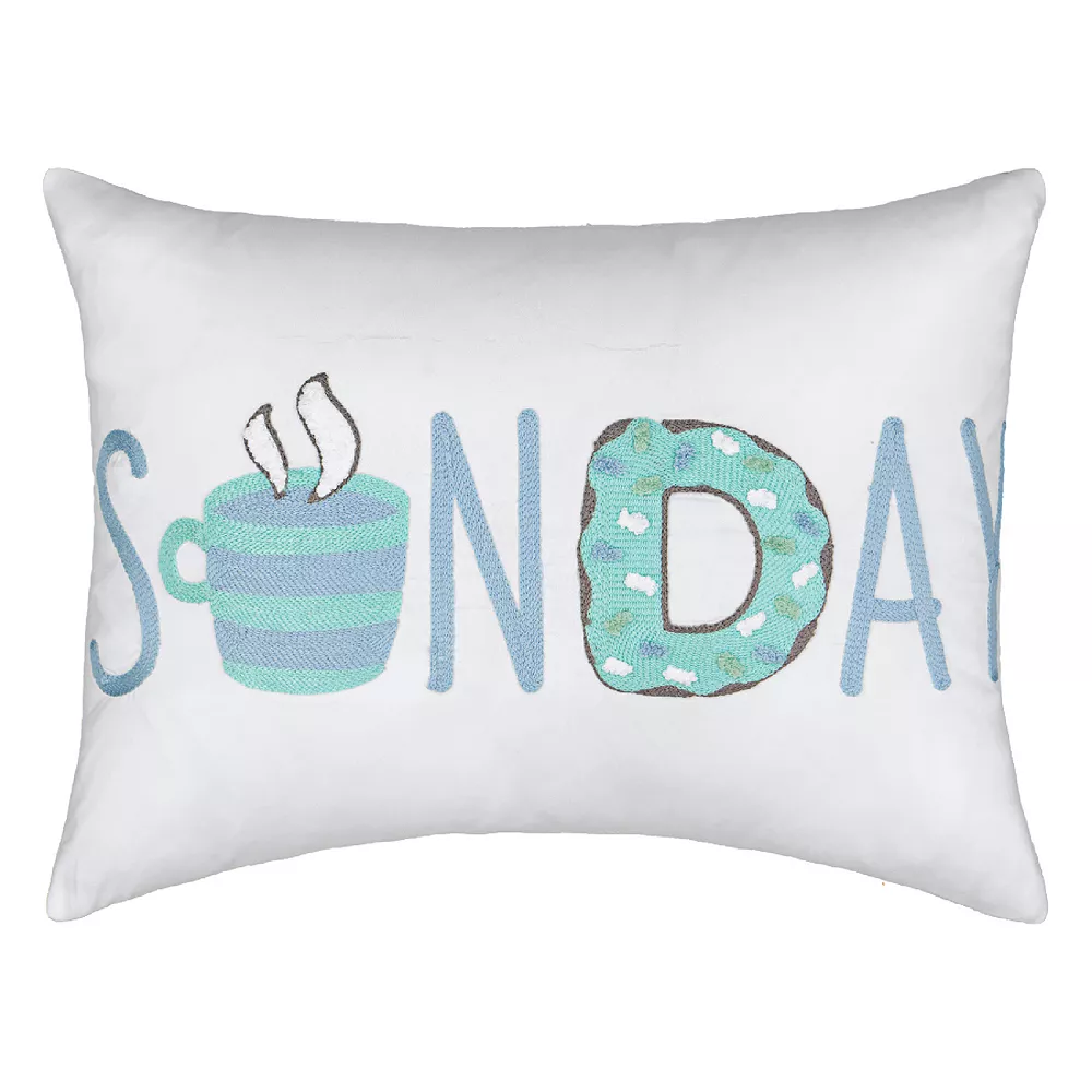 Bring their imaginations to life with whimsical accessories by Spree by Waverly. This adorable pillow features the word Sunday using cute mug and donut motifs. Printed on a solid white background. Print featured on face only.